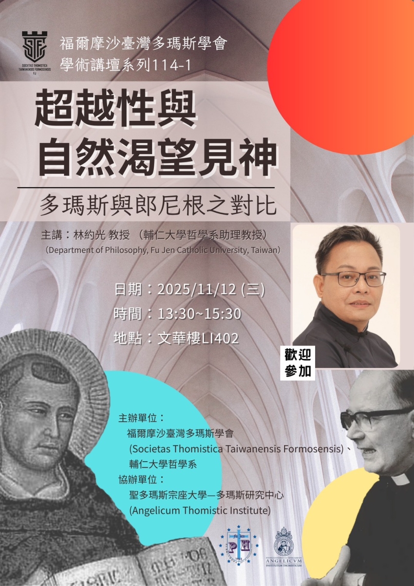 福爾摩沙臺灣多瑪斯學會將於2025.11.12(三)舉辦多瑪斯主題講座。本次講座邀請輔仁大學哲學系的林約光教授主講,主題為「超越性與自然渴望見神:多瑪斯與郎尼根之對比」。講座將先從超驗多瑪斯學派郎尼根對意識意向性與「與神相愛中的存有」的探討出發,闡述人之超越性的哲學意涵,並進一步從多瑪斯的觀點出發,展開中世與當代思想的對話。講座期盼藉由兩者的對照與省思,為當代文化危機提供新的理解視野與理論啟示。